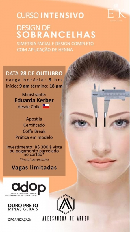 A profissional chilena Eduarda Kerber, em parceria com a Agência de Desenvolvimento Econômico e Social de Ouro Preto (ADOP), ministra o curso internacional de design de sobrancelhas no dia 28 de outubro, das 9:00h as 18:00h.