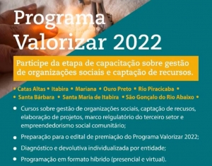 Ele acontece desde 2013 em Ouro Preto, Mariana e Catas Altas e, em 2022, vai contemplar também instituições de Itabira, Rio Piracicaba, Santa Bárbara, Santa Maria de Itabira e São Gonçalo do Rio Abaixo. Outra novidade desta edição é que ela será dividida em duas etapas. Além do edital de premiação, que será lançado futuramente, as organizações também poderão participar de uma etapa de capacitação.
